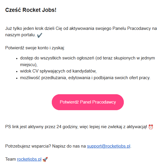 Po sfinalizowaniu zakupu pakietu ogłoszeń, Twój opiekun biznesowy wygeneruje link do ustawienia hasła do Panelu Pracodawcy. Link będzie ważny przez 24 godziny. Jeżeli nie widzisz go w skrzynce odbiorczej i folderze SPAM - skontaktuj się ze swoim opiekunem.