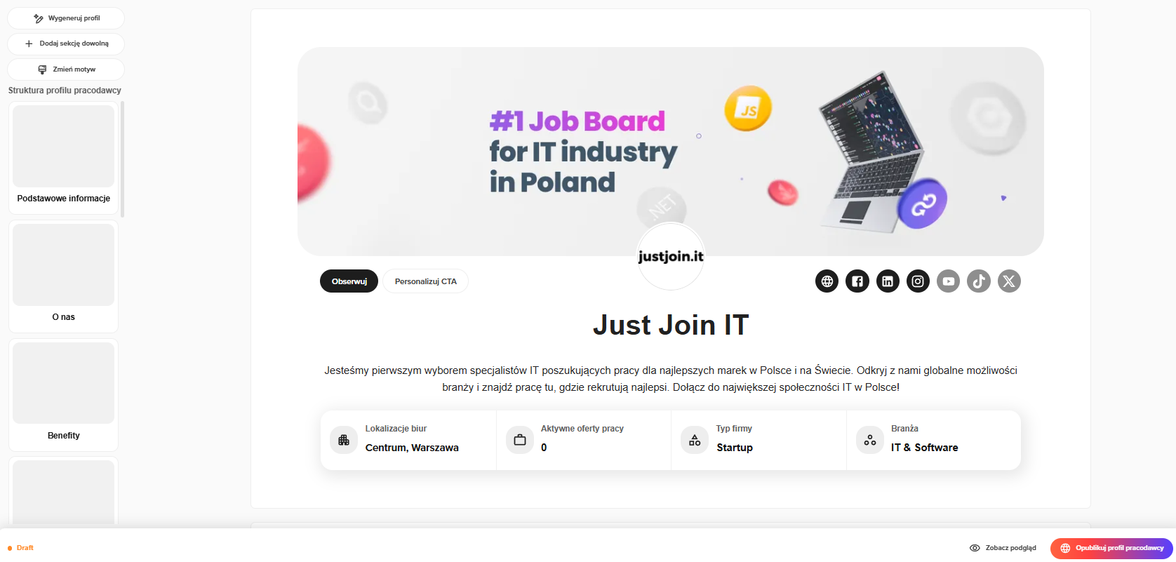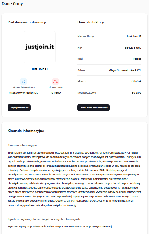 W tym miejscu możesz zarządzać danymi swojej firmy. Każda wprowadzona aktualizacja zostanie automatycznie uwzględniona we wszystkich przyszłych ogłoszeniach.