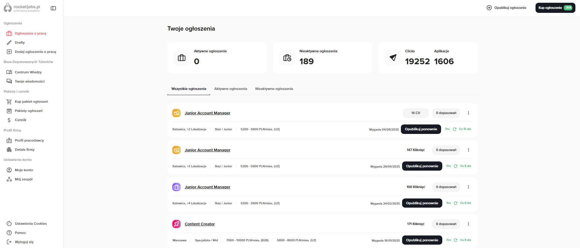 Każda firma korzystająca z RocketJobs.pl posiada swój unikalny Panel Pracodawcy. Jest to miejsce, umożliwiające łatwe dodawanie i zarządzanie ofertami pracy.