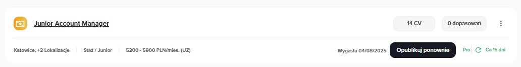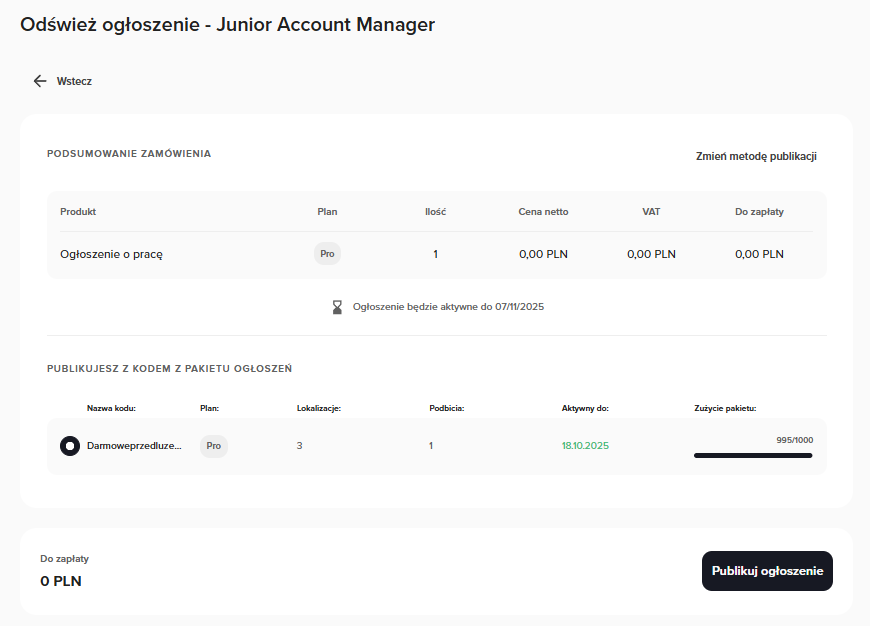 Chcesz ponownie opublikować wygasłą ofertę? Kliknij „Opublikuj ponownie”, a potem wybierz pakiet, z którego ogłoszenie ma zostać opublikowane i kliknij „Publikuj ogłoszenie”.