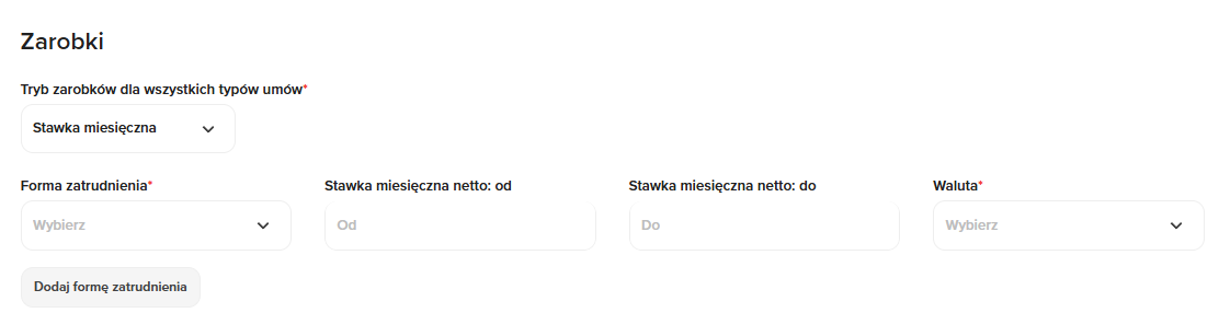 Uwaga: w polu "Tryb zarobków dla wszystkich typów umów" możesz wybrać jedną opcję, niezależnie od tego, czy oferujesz dwa rodzaje umów. Oznacza to, że nie możesz wskazać stawki miesięcznej dla umowy o pracę i stawki godzinowej dla umowy B2B.