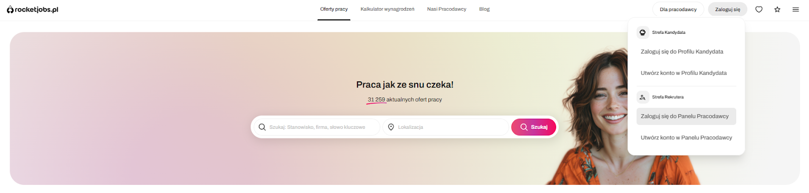 KROK 1: Wejdź na stronę główną rocketjobs.pl i kliknij Zaloguj się ➡︎ Zaloguj się do Panelu Pracodawcy: