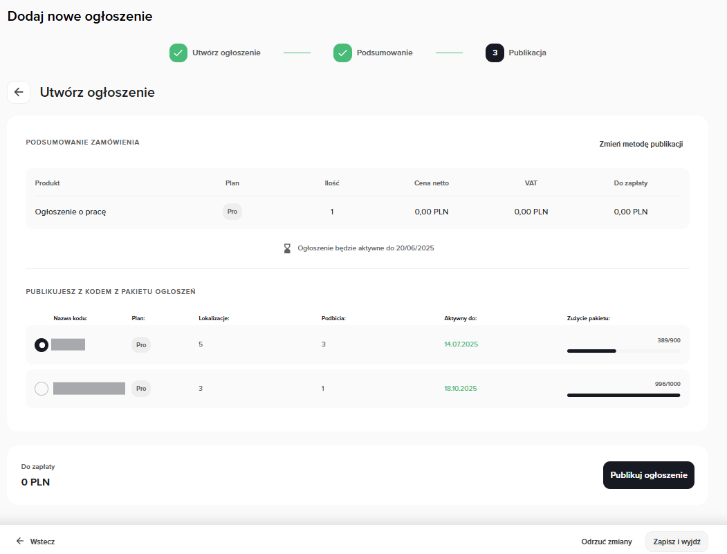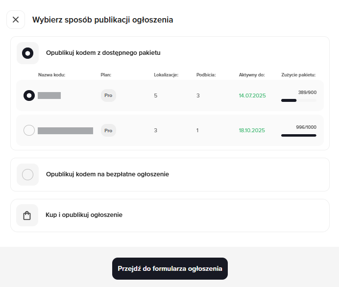 KROK 17: Tutaj wybierz kod (jeżeli masz więcej, niż jeden), a następnie “Publikuj ogłoszenie”.