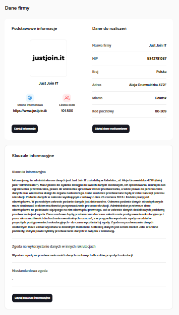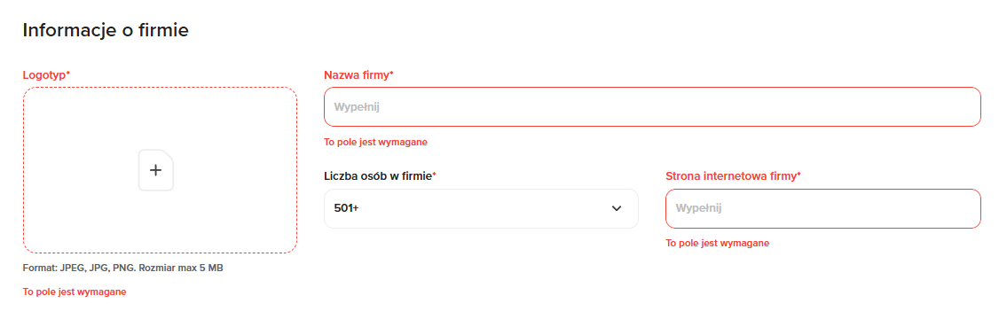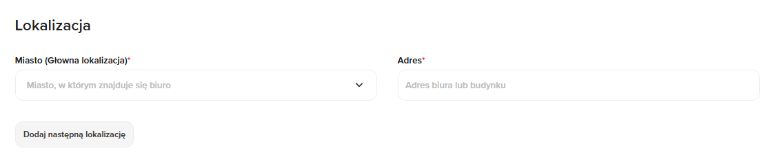 W przypadku, gdy Twoja firma nie posiada biura lub prowadzi rekrutację w całej Polsce, jako “Miasto” polecamy wpisać jedno z dużych miast (np. Warszawę), natomiast w polu “Adres” polecamy postawić myślnik “-”.