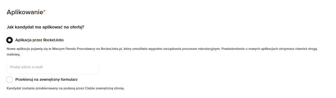 W tym miejscu wybierz, w jaki sposób kandydat ma zaaplikować na ofertę pracy: