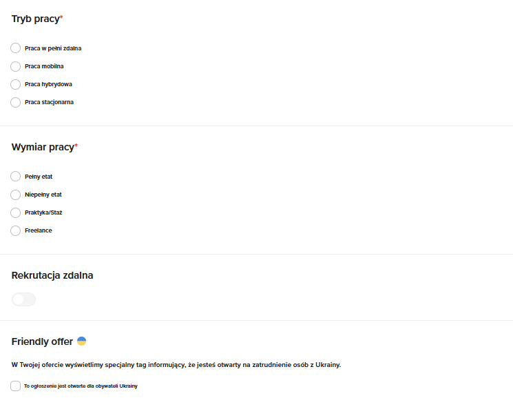 Jeżeli jesteś otwarty na obywateli Ukrainy, zaznacz pole „To ogłoszenie jest otwarte dla obywateli Ukrainy”. Po oznaczeniu tej pozycji w Twojej ofercie wyświetli się specjalny tag informujący, że jesteś otwarty na zatrudnienie osób z tego regionu.