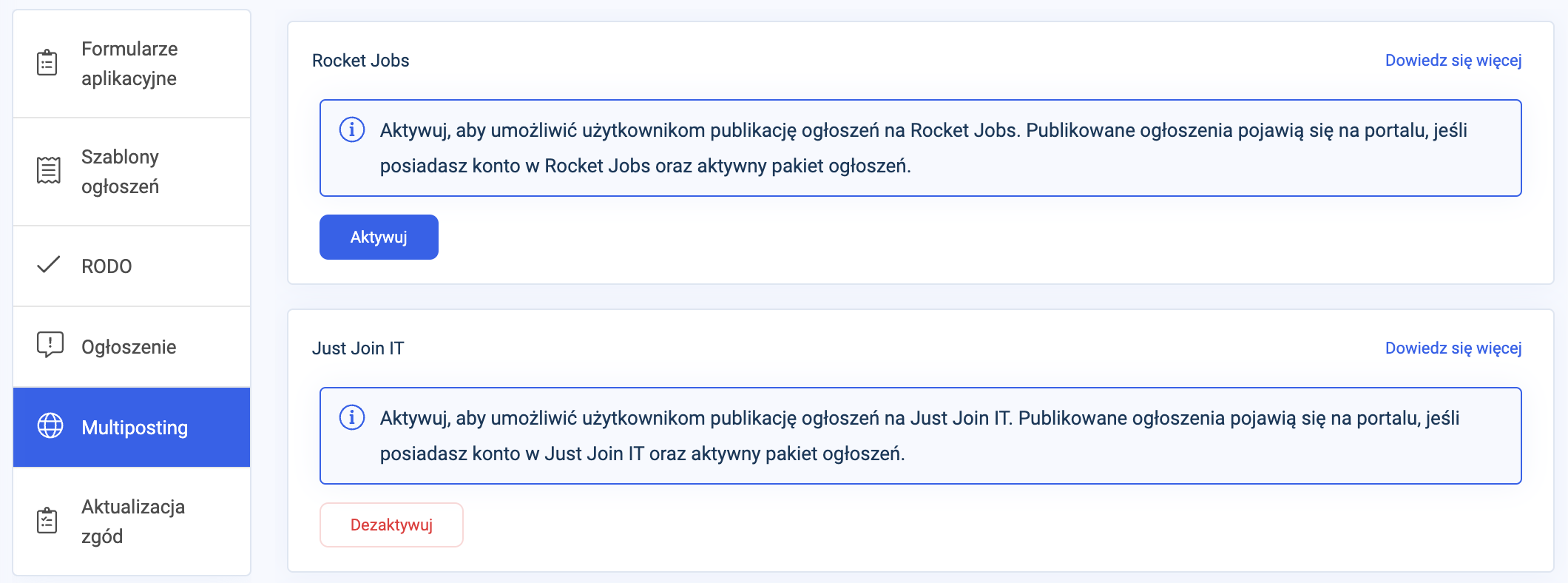 Aby zintegrować swojego TRAFFITa z justjoin.it, wejdź do zakładki Ustawienia → Ogłoszenia i klauzule → Multiposting