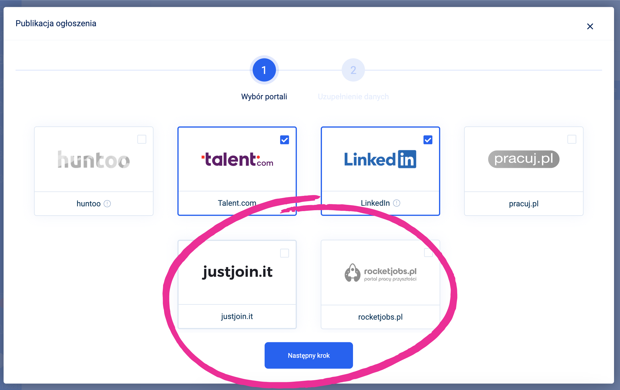 Po stworzeniu nowego ogłoszenia lub wybraniu opcji Publikuj ogłoszenie na istniejącym w systemie ogłoszeniu pojawi się opcja publikacji na justjoin.it: