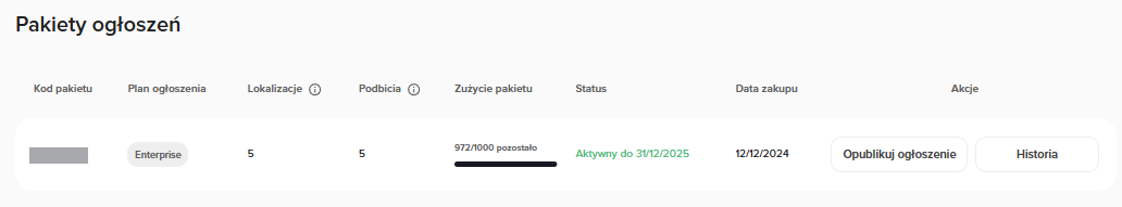 Zużycie pakietu ogłoszeń oraz datę jego wygaśnięcia można sprawdzić po zalogowaniu się do Panelu Pracodawcy. Po lewej stronie znajduje się przycisk “Pakiety ogłoszeń” gdzie można sprawdzić wszystkie szczegóły (pozostała ilość ogłoszeń, wariant, data wygaśnięcia itd.) odnośnie aktywnego pakietu.