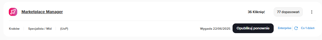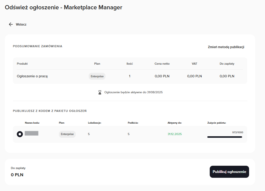 Aby wznowić ogłoszenie, zaloguj się do Panelu Pracodawcy, a następnie znajdź ogłoszenie, które chcesz wznowić. Obok ogłoszenia znajduje się przycisk “Opublikuj ponownie”, po kliknięciu zostaniesz przeniesiony do płatności. Teraz wybierz zakładkę “Publikujesz z kodem z pakietu ogłoszeń”, wybierz podpięty kod, a następnie kliknij “Publikuj ogłoszenie”.