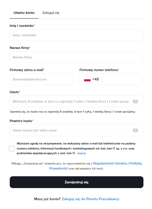 Rejestracja do Panelu Pracodawcy następuje automatycznie po opublikowaniu pierwszego ogłoszenia poprzez “Dodaj ogłoszenie” lub przez przycisk “Utwórz konto w Panelu Pracodawcy” na stronie głównej portalu.