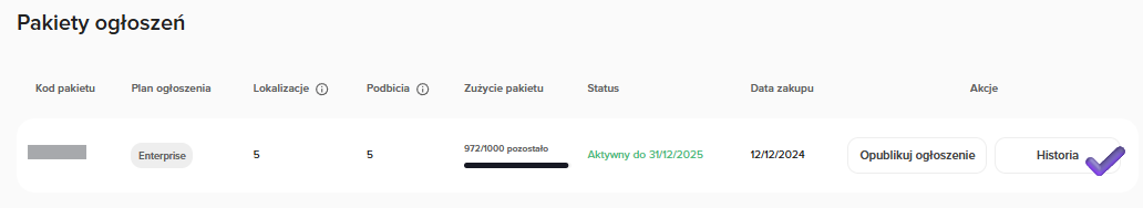 Zaloguj się do Panelu Pracodawcy, a następnie przejdź do sekcji „Pakiety ogłoszeń” znajdującej się w menu po lewej stronie. Przy wybranym pakiecie kliknij w odnośnik „Historia”, aby wyświetlić listę wszystkich opublikowanych ogłoszeń – wraz z datą, godziną publikacji oraz informacją o osobie, która je zamieściła.