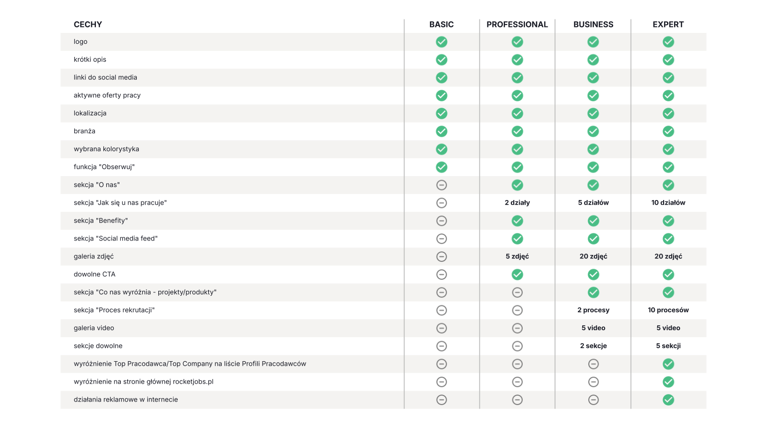 Uwaga o pakietach: Nie wszystkie elementy są dostępne w planie podstawowym. Jeśli chcesz odblokować dodatkowe sekcje (np. większą liczbę działów, wideo, „Proces rekrutacji”, sekcje dowolne, CTA, wyróżnienia, kampanię), porozmawiaj ze swoim opiekunem handlowym — dobierze właściwy pakiet do Twoich celów.